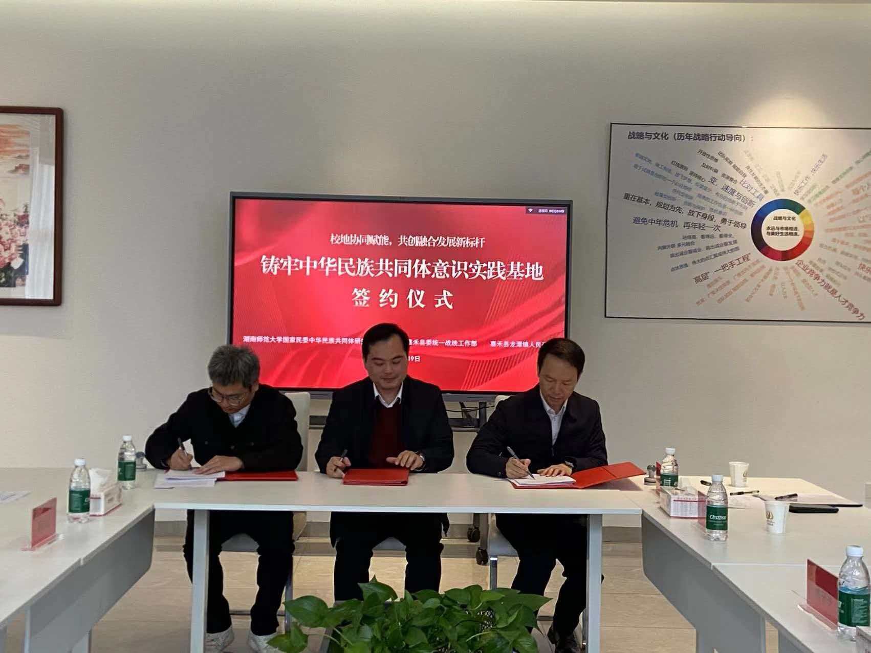 在与会人员的共同见证下,县委统战部、湖南师范大学国家民委中华民族共同体研究基地、龙潭镇人民政府三方代表共同签署了战略合作协议。仪式后,各方代表合影留念。