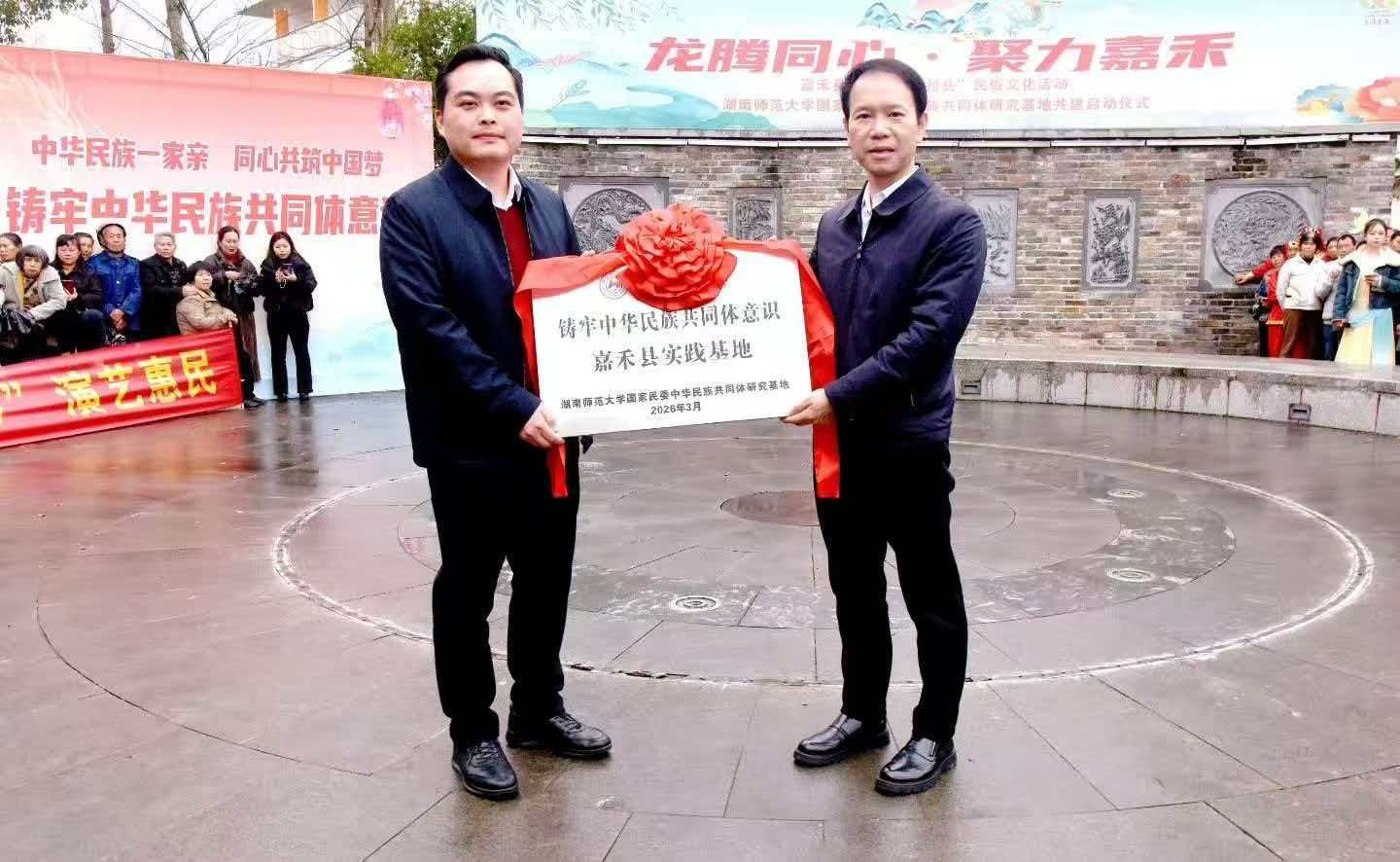 在热烈的掌声中,湖南师范大学国家民委中华民族共同体研究基地副主任陈文雄和嘉禾县委副书记、统战部长蒋中平携手,共同为校地合作“铸牢中华民族共同体意识实践基地”正式授牌。此举标志着湖南师范大学国家民委中华民族共同体研究基地与嘉禾县的合作迈入实质性阶段,双方将在理论研究、文化传承、实践创新等方面开展全方位合作,共同探索铸牢中华民族共同体意识的基层实践路径。